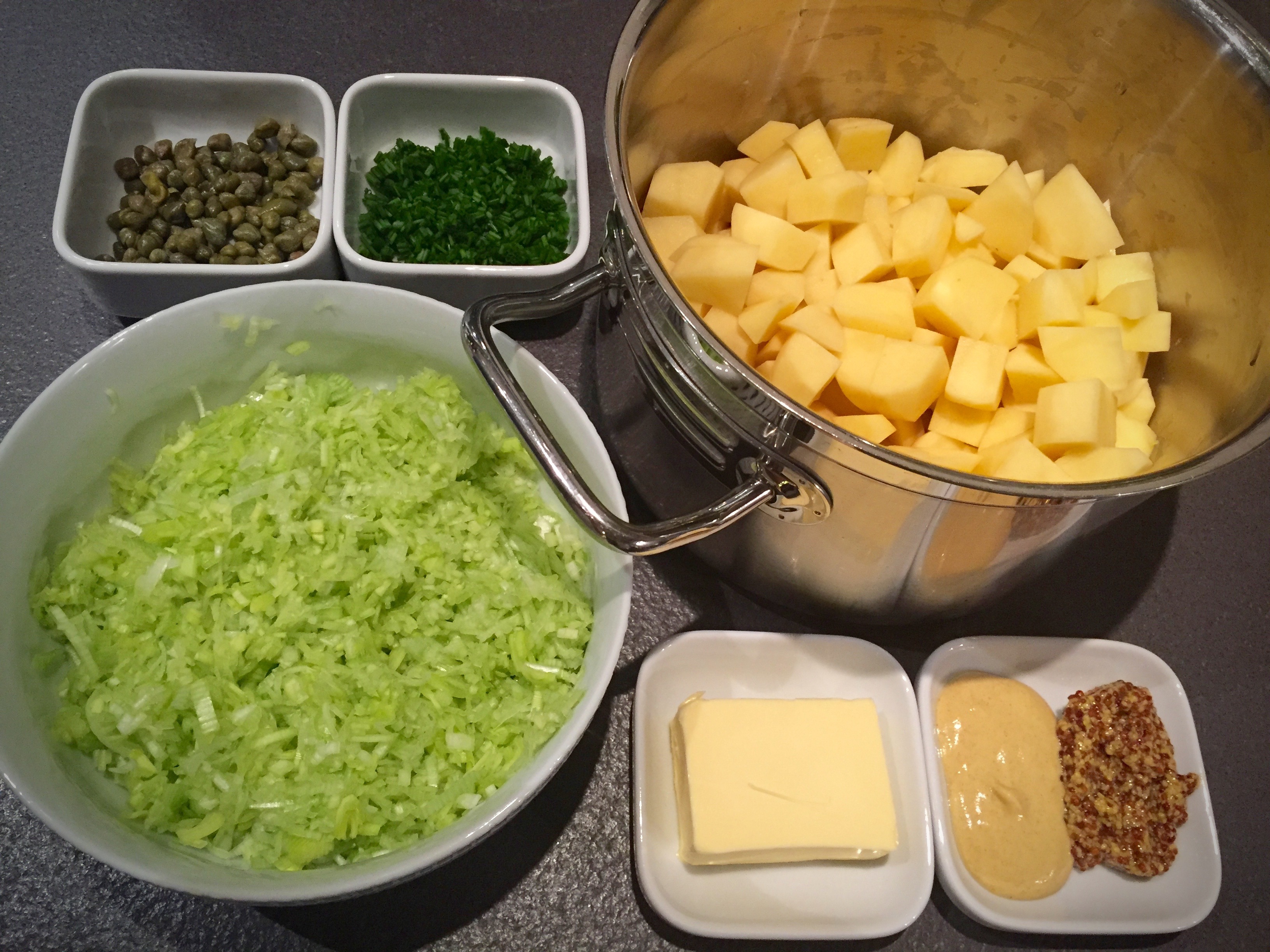 - Let the leek cool, then add to the mashed potatoes along with the 2 mustards, chives, and capers. Stir to combine and let cool.