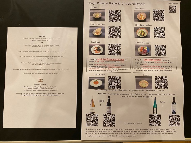 De Jonge Dikkert currently serves a weekly changing take out menu (@ Home 2.0, I guess referring to the second restaurant lock-down in the Netherlands). There is a fixed 4-course menu for €39,50. Pick up at the restaurant is possible on Friday through Sunday. For Fridays and Saturdays, there is also a pickup point at the pop-up wine store of Wijnhandel B.J. de Logie in Badhoevedorp, and home delivery is possible if you live in the larger Randstad area. The delivery charge is €27,50.