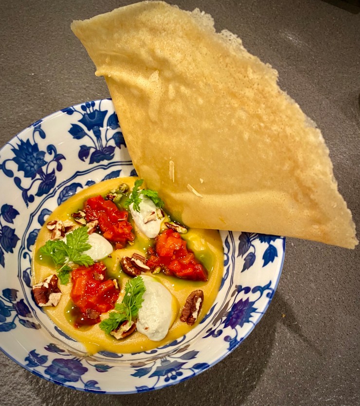 Good products, ample portions, interesting taste combinations (Bergamot and Brussels Sprouts!) and use of cheese in the dishes. Relative downsides were the lentil soup (which tasted great but was very thick and the brick pastry sheets were rather greasy) and the dessert (looked beautiful, but the amaretti got soggy from the sauce and the candied orange peel was quite chewy and very bitter). Even though not everything was perfect, we were overall very pleased with the food box by De Jonge Dikkert and the wines!