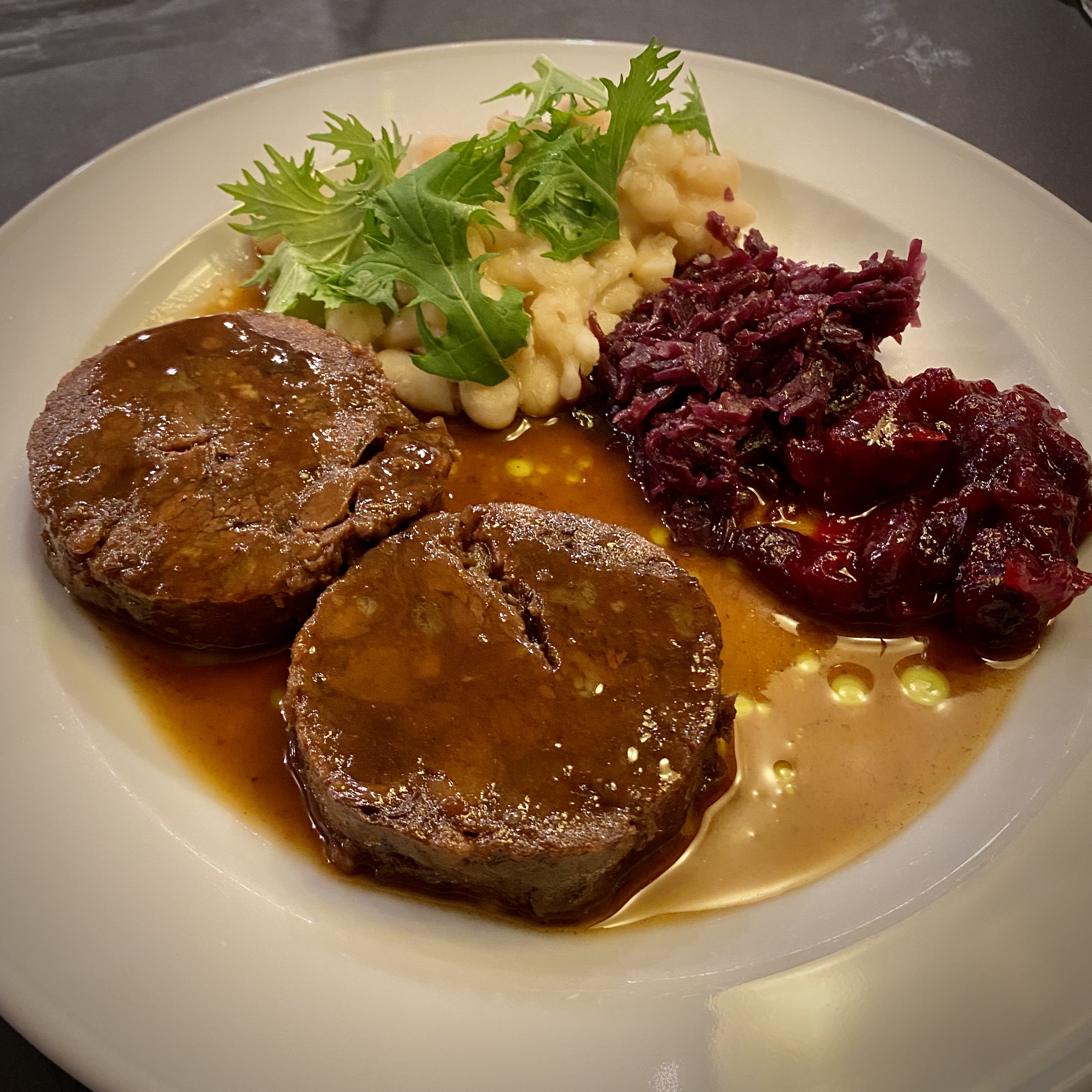 The starters and mains always have a vegetarian option, and you can just pick and choose from each of the courses. Consequently, we had a predominantly vegetarian menu, with the only exception being the seasonal Braised Venison with Red Cabbage and Cranberry Sauce that I chose for my main course. Options to expand your menu are homemade bread and butter (€4,50) as well as a cheeseboard (€8), which consists of five cheese, garnishes and bread.