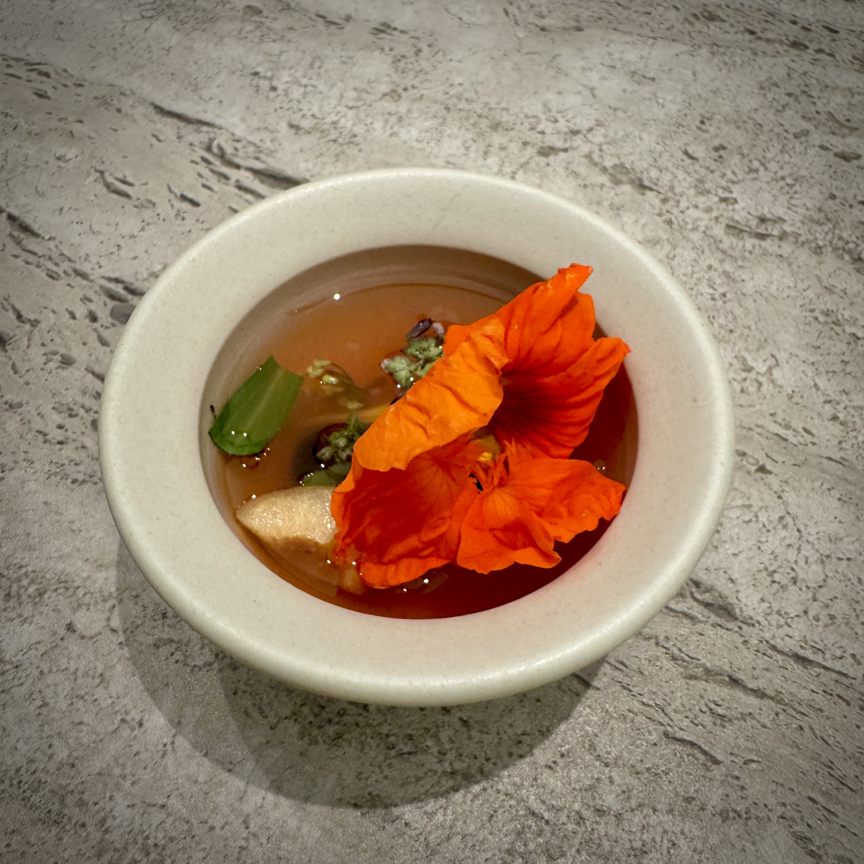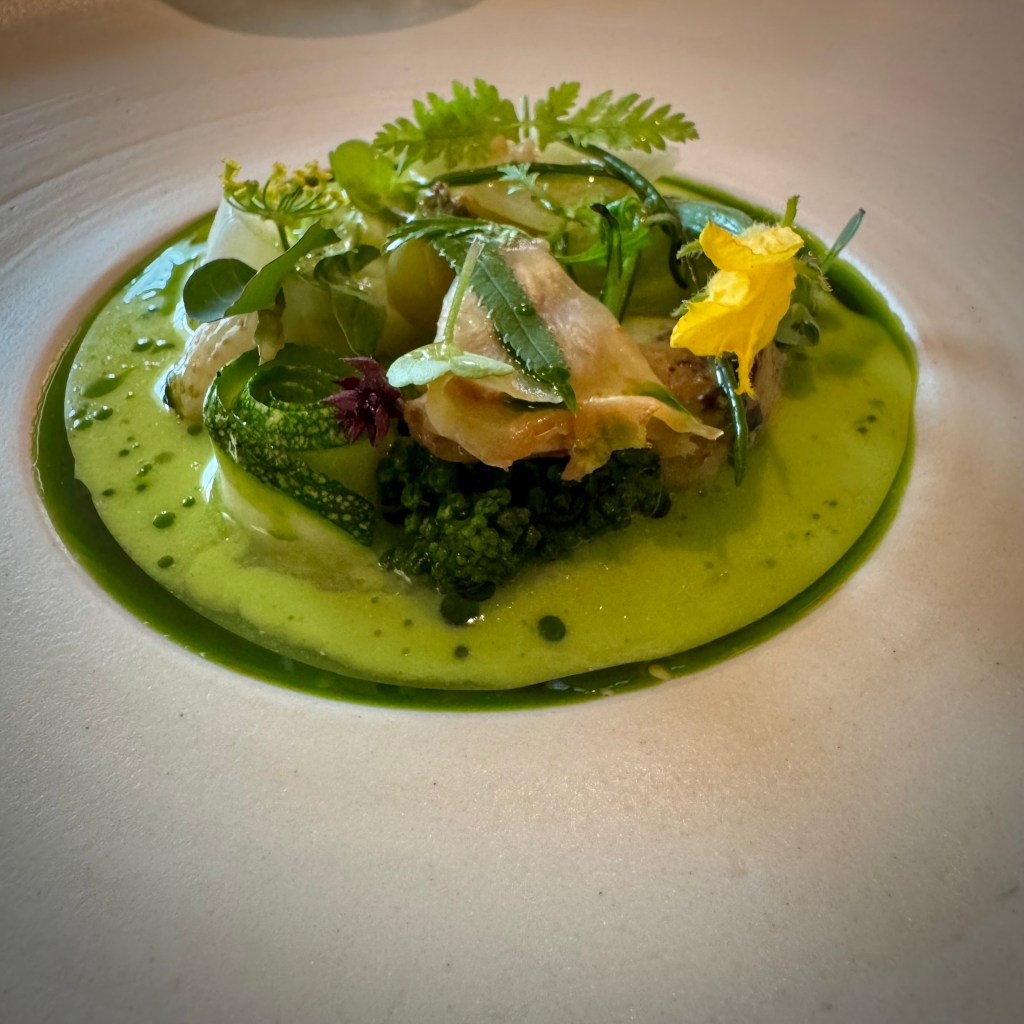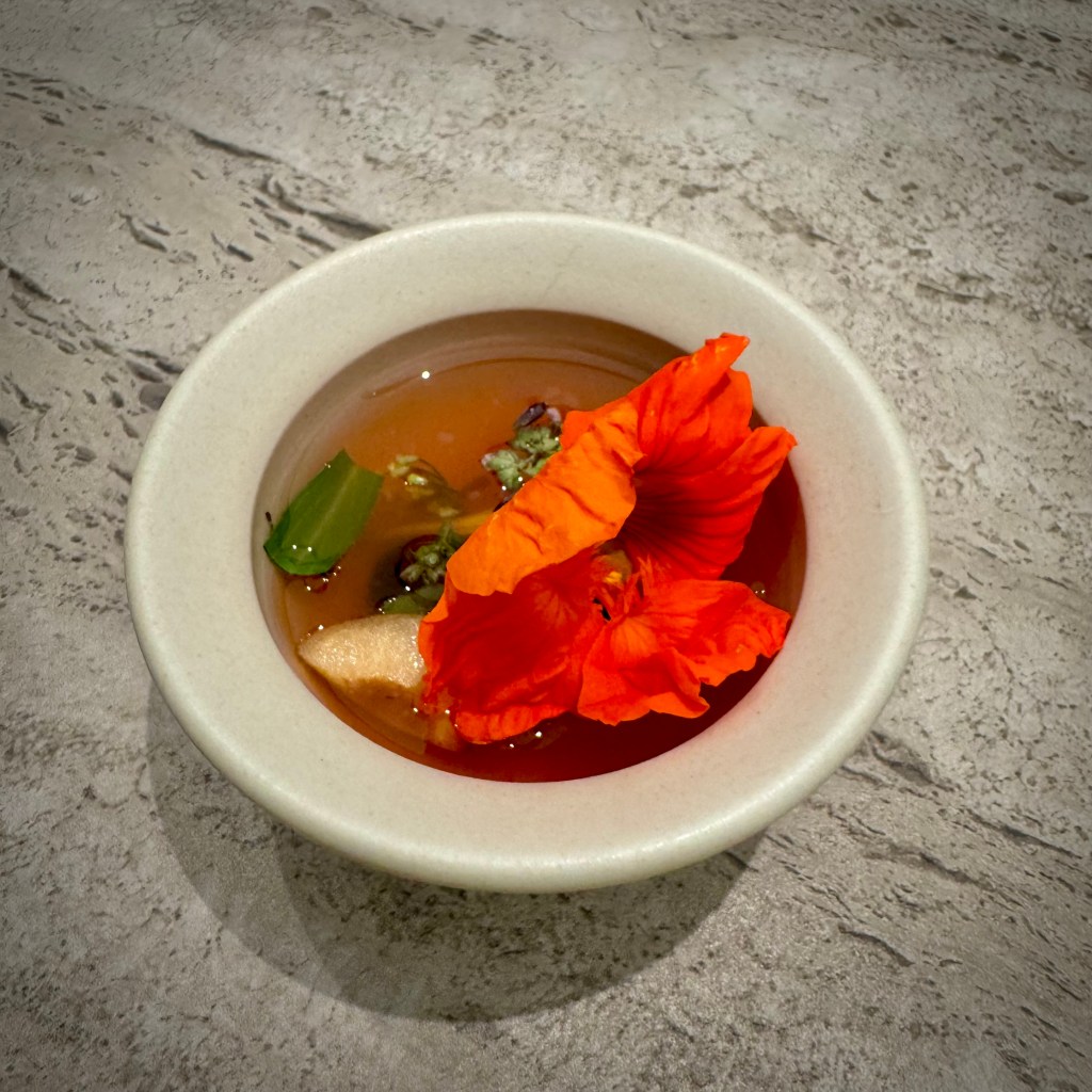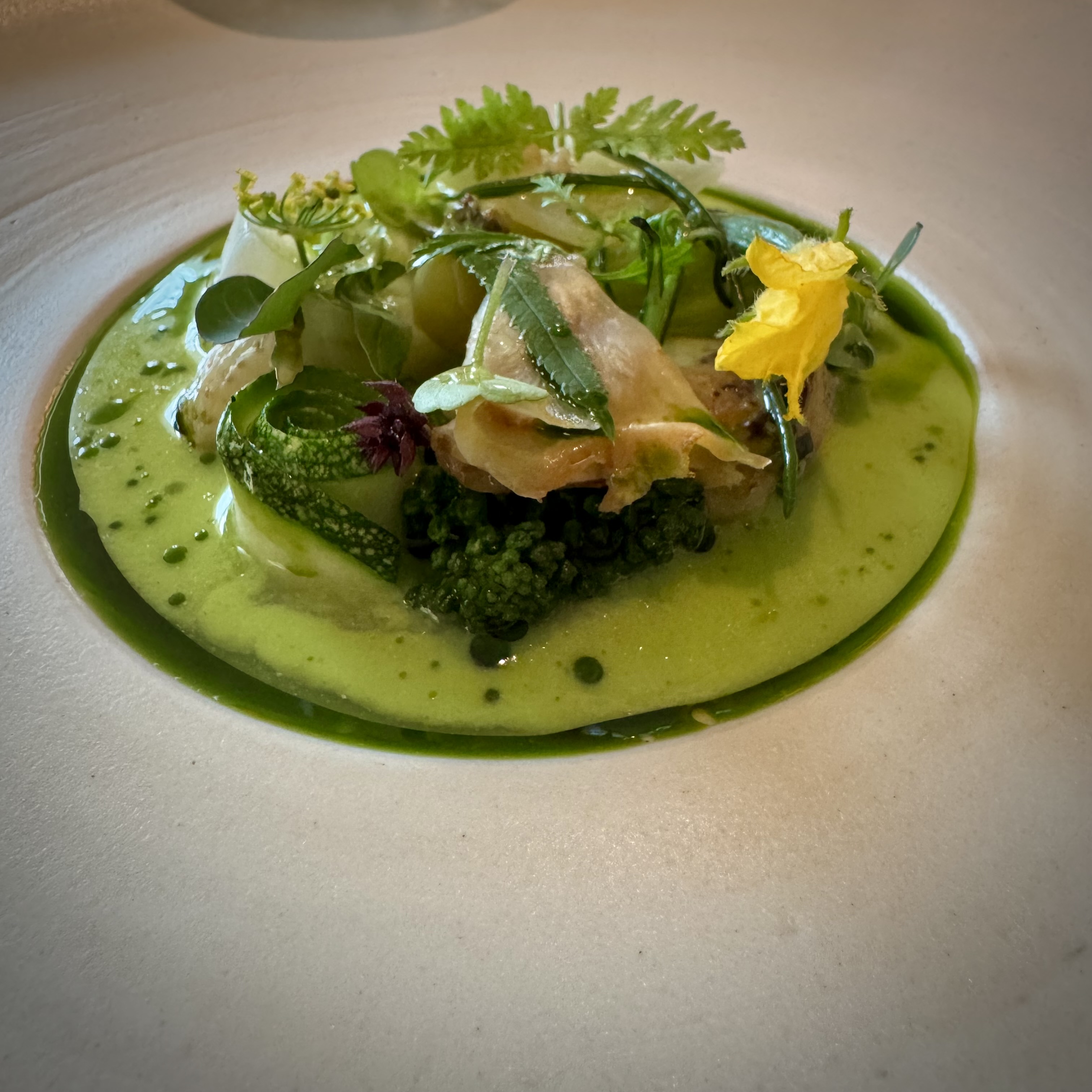 Then we kicked off with our Botanic menus, straight into the only signature dish of Flore: a delightfully fresh combination of 25 vegetables, fruits, herbs, and flowers. A composition of spicy, floral, bitter, zesty notes, all in harmony. A common denominator throughout the evening.