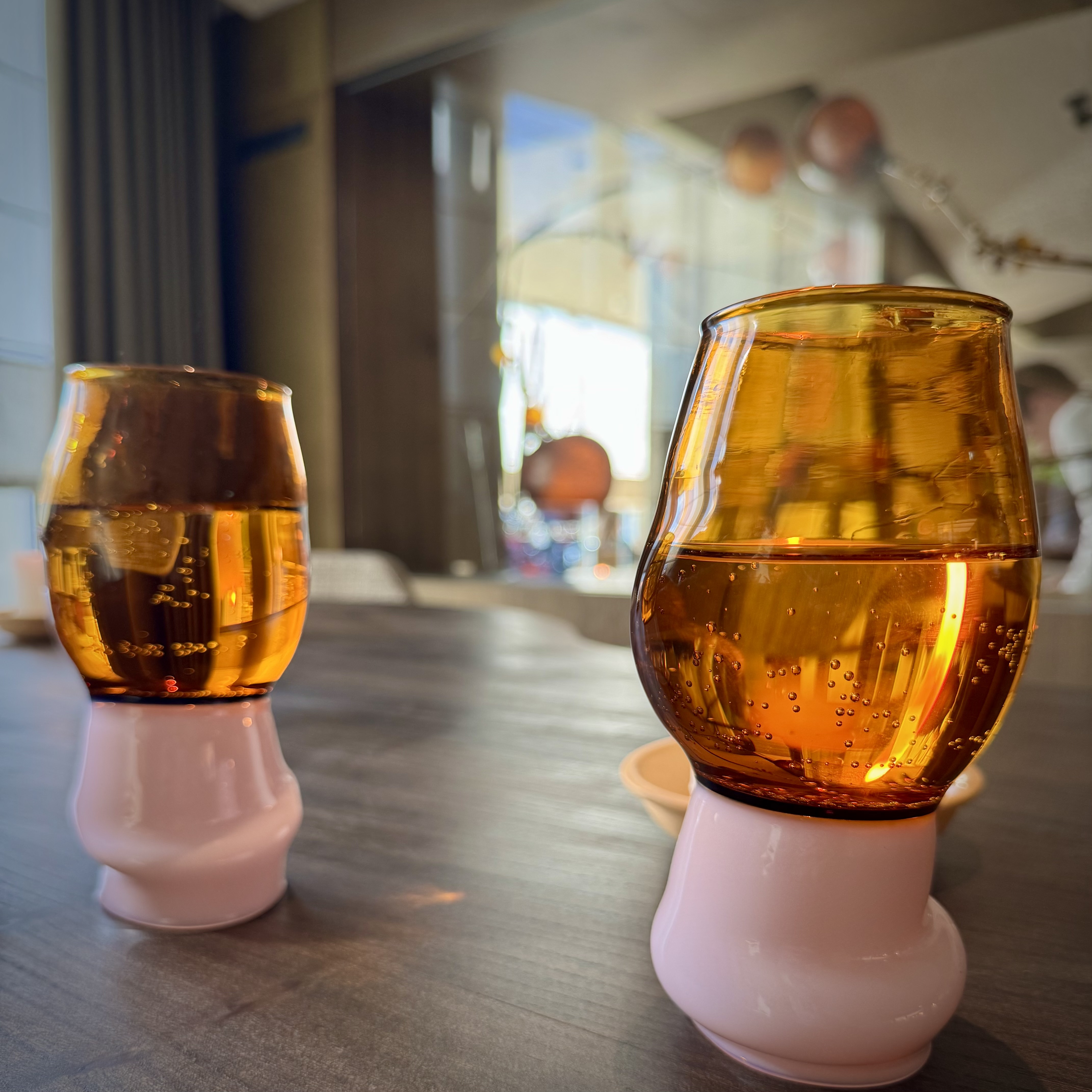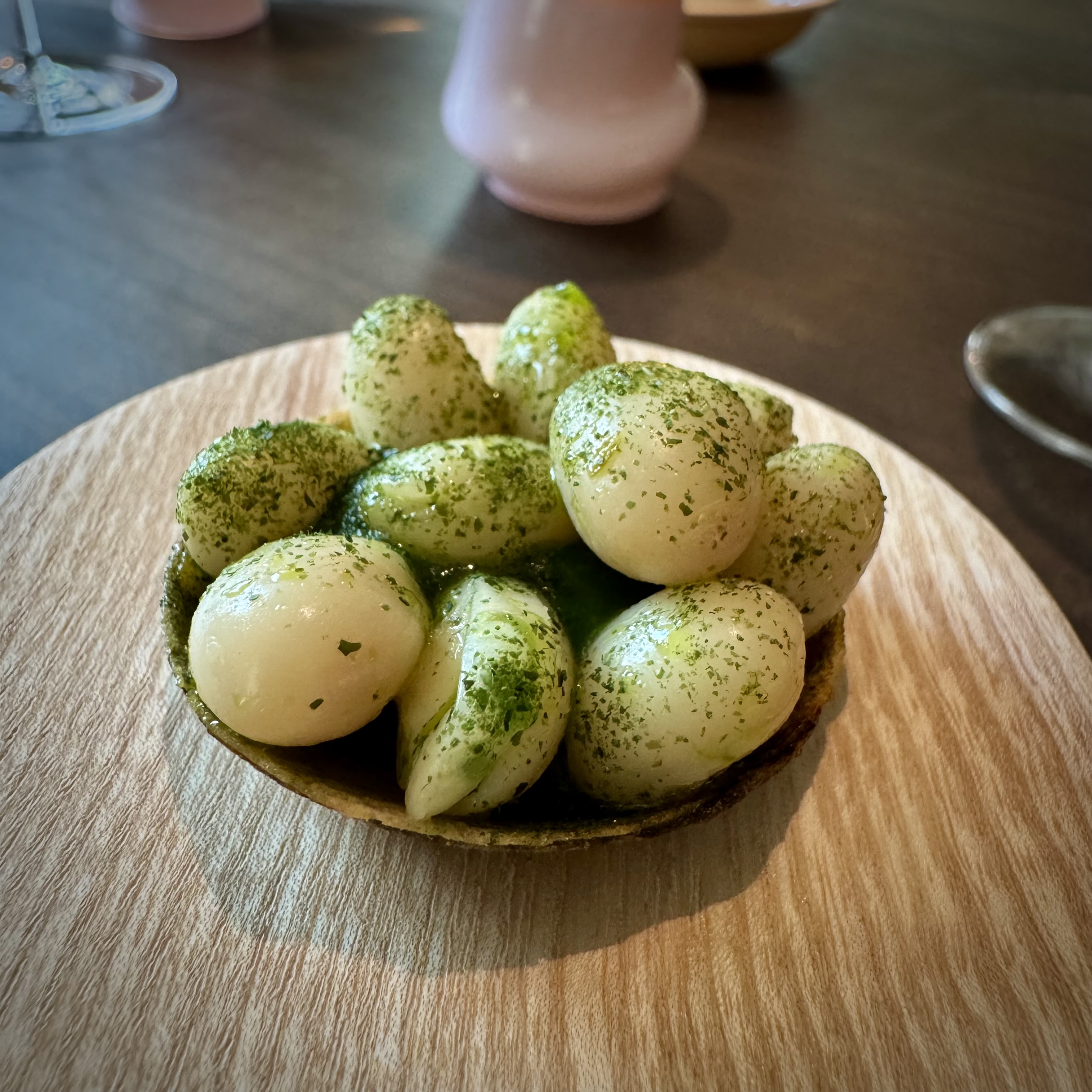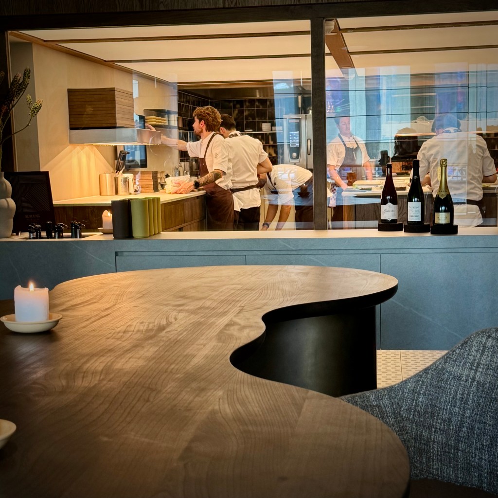 We took a tour of the kitchen and were then ushered to the Kitchen table, which is a communal table with up to 10 seats. The intimate room didn’t feel cramped due to the glass dividers. On our left, we had a view over Amsterdam’s canals, while to the right and centre, we saw the kitchen and the main dining room, with the station where the cocktails were mixed. The minimalist remodelling — featuring curved booths, pale wood, thick tables, and lots of earth tones — turned out very nicely. Despite all the background entertainment, there was little distraction from what was happening on the plates!