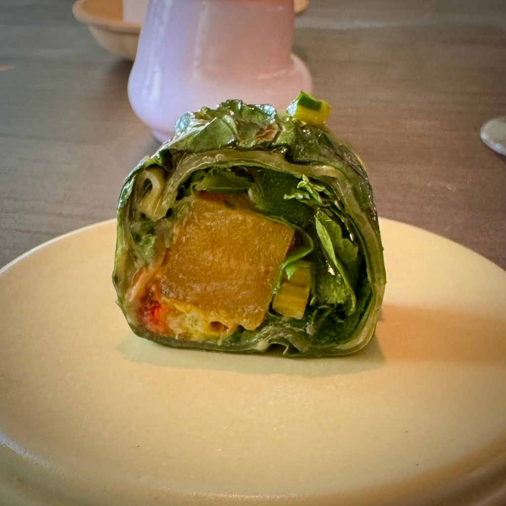 The indicated 3½-hour timeframe was indeed leisurely and at an agreeable pace. Additionally, due to the lack of dairy, the portions are generous enough to accommodate all seven courses comfortably.