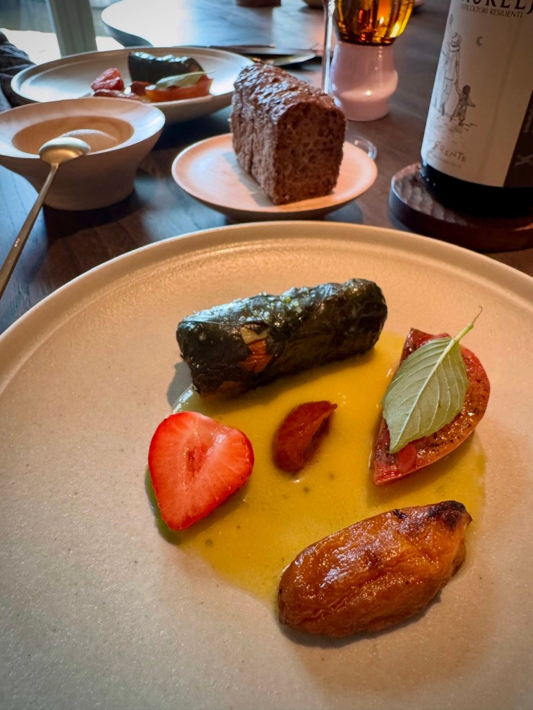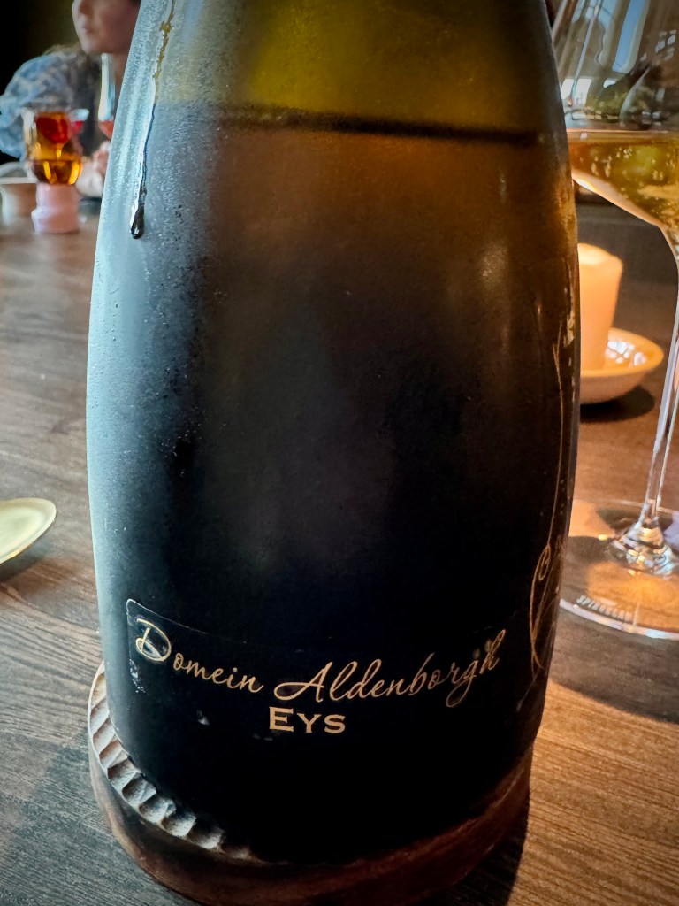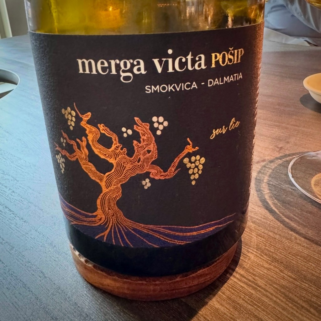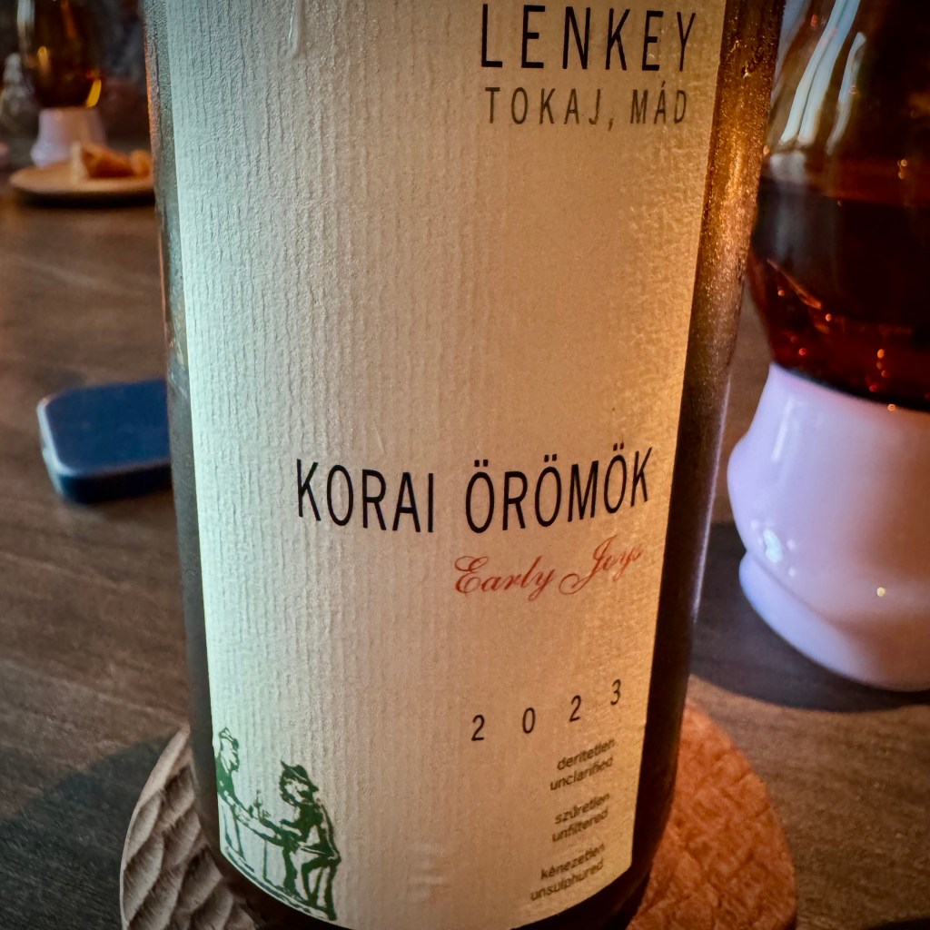 Upon suggestion, Chantal landed on a skin contact 2023 Tokaj by Lenkey Pincészet (€16). The Korai Örömök / “Early Joys” moniker refers to the blend of varietals (Muscat Otthonel, Zengő, Zenit, Cserszegi Fűszeres, and Zalagyöngye) that are harvested a couple of months before the big Tokaji harvest of Furmint and Hárslevelű grapes.